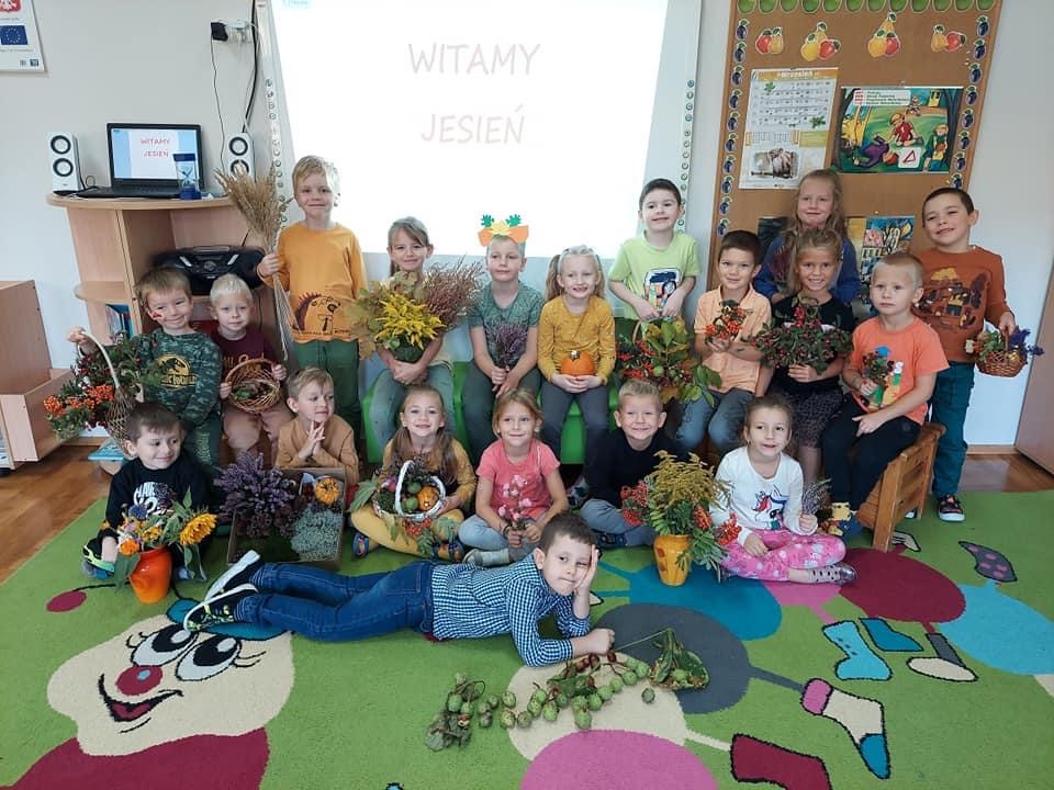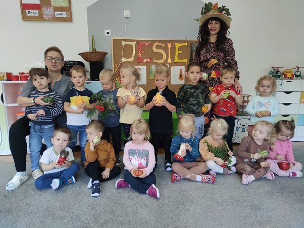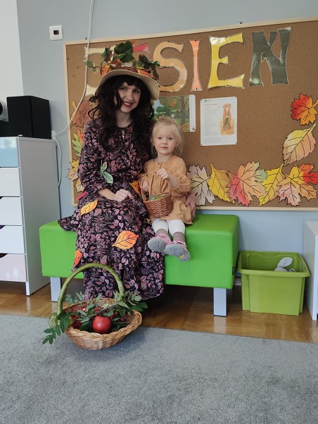 Dnia 23 września w naszym przedszkolu można było spotkać Panią Jesień, która zawitała do każdej sali i przyniosła koszyk pełen jesiennych darów. Dzieci zastanawiały się, co jest w koszyku. Odgadywały jesienne zagadki, rozpoznawały dary jesieni poprzez dotyk. Pani Jesień przedstawiając się opowiedziała dzieciom o sobie wymieniając charakterystyczne cechy jesieni. Wspólnie z dziećmi bawiła się, a na zakończenie zabrzmiała wesoła piosenka. Żegnając się z dziećmi Pani Jesień obiecała, że wróci w przyszłym roku.