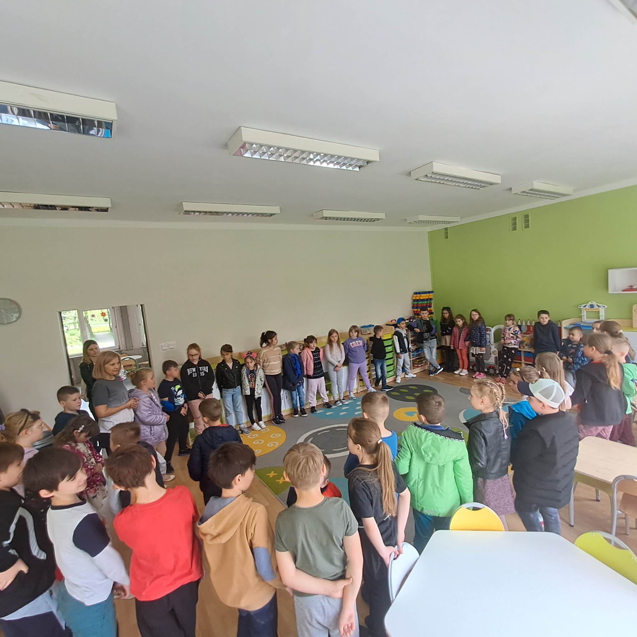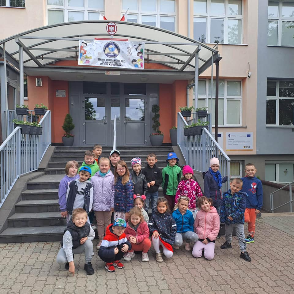 Wycieczka Skrzatów do Szkoły Podstawowej Nr 3. Uczestniczenie w zajeciach dydaktycznych oraz zwiedzanie pomieszczeń szkolnych. Przedszkolaki zwiedziły: bibliotekę, sale eksperymentów, stołówkę, sale gimnastyczną, świetlicę oraz szatnię.