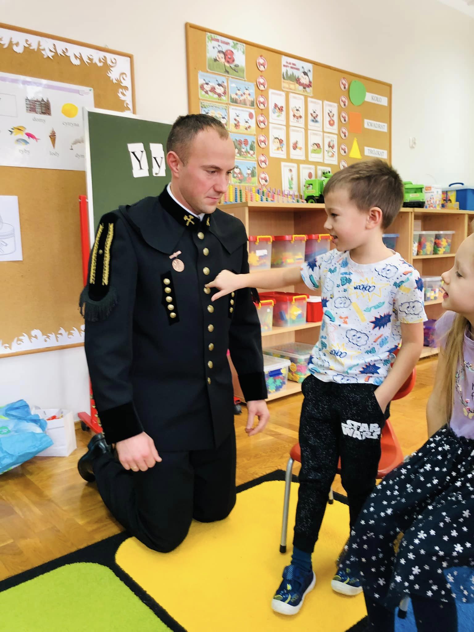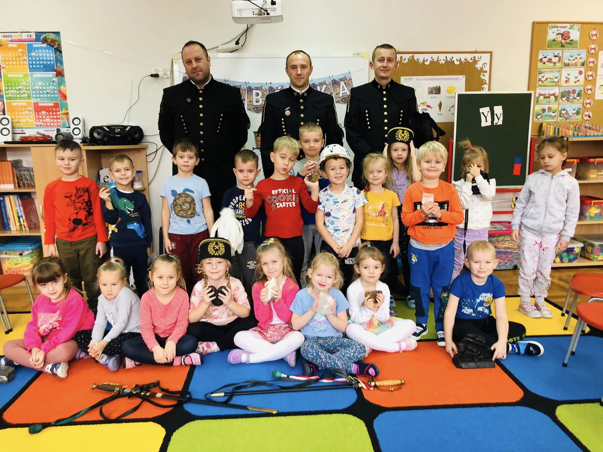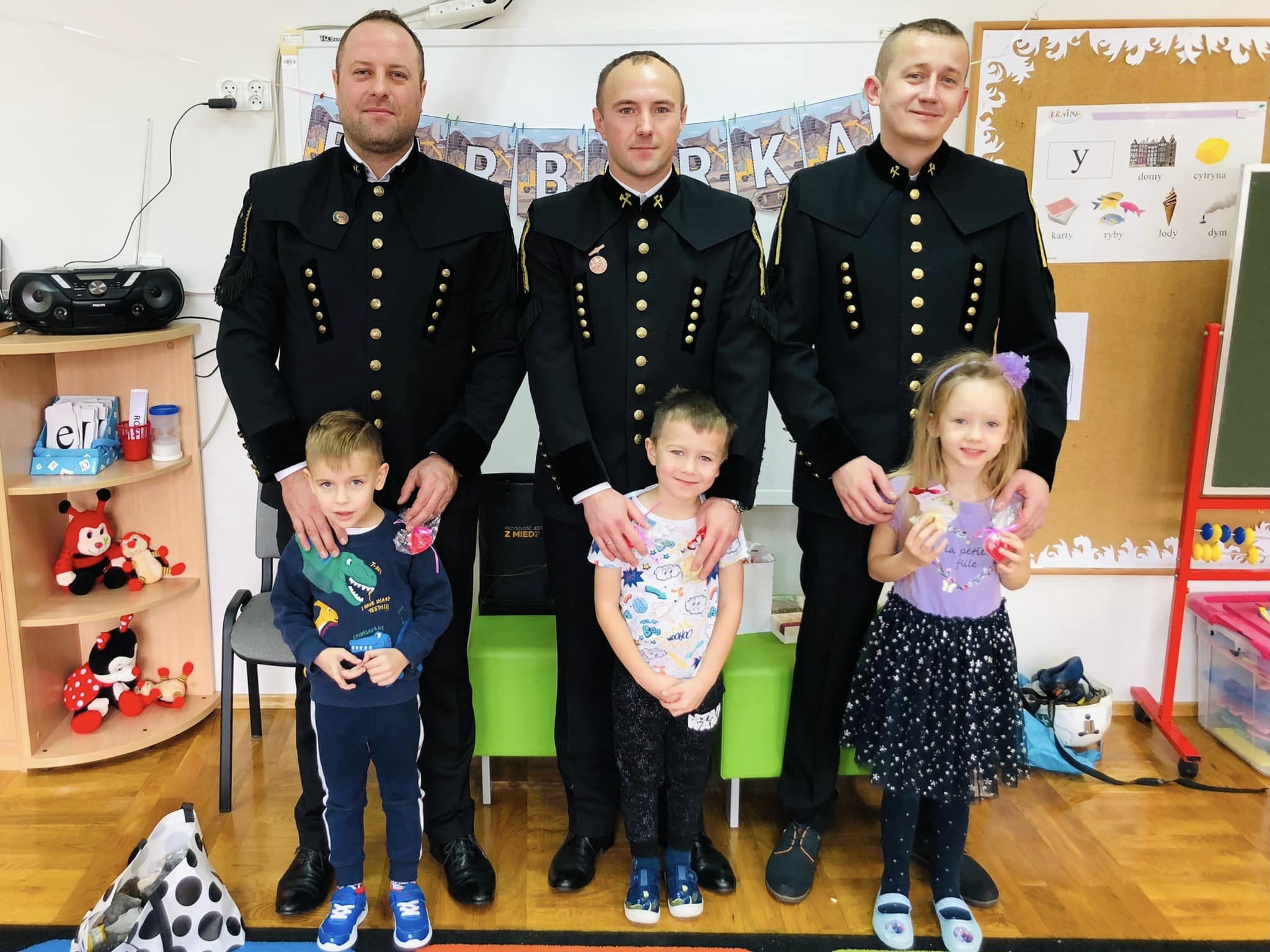 Panowie opowiedzieli na czym polega ich praca, omówili elementy stroju górniczego i ich symbolikę. Wyjaśnili, że praca górnika jest ciężka i niebezpieczna, ale potrzebna. Zaprezentowali zdjęcia maszyn i urządzeń, które służą im w pracy. Opowiedzieli również o niektórych tradycjach związanych z zawodem górnika. Dzieci dostały mnóstwo prezentów od naszych wspaniałych gości.