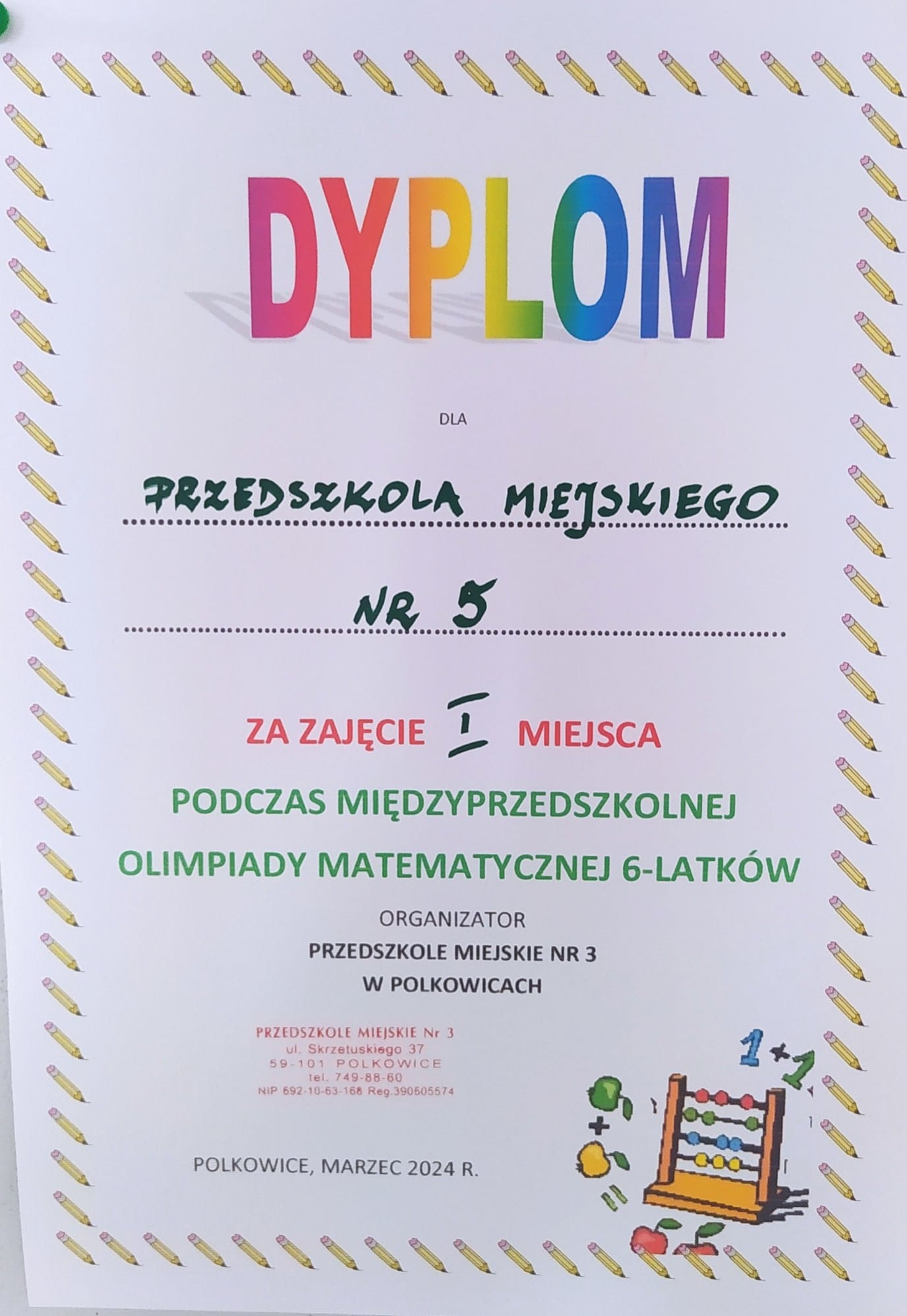 14 marca z okazji Światowego Dnia Matematyki w Przedszkolu Miejskim nr 3 w Polkowicach już po raz 14 odbyła się Międzyprzedszkolna Olimpiada Matematyczna dzieci 6-letnich. Wzięły w niej udział trzyosobowe drużyny z polkowickich przedszkoli. Celem olimpiady było rozwijanie zainteresowań i uzdolnień matematycznych dzieci, kształtowanie odporności emocjonalnej, rozwijanie operacyjnego rozumowania oraz doskonalenie współpracy w zespole.