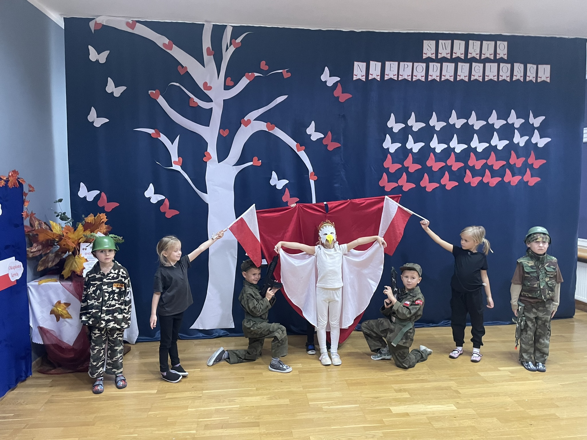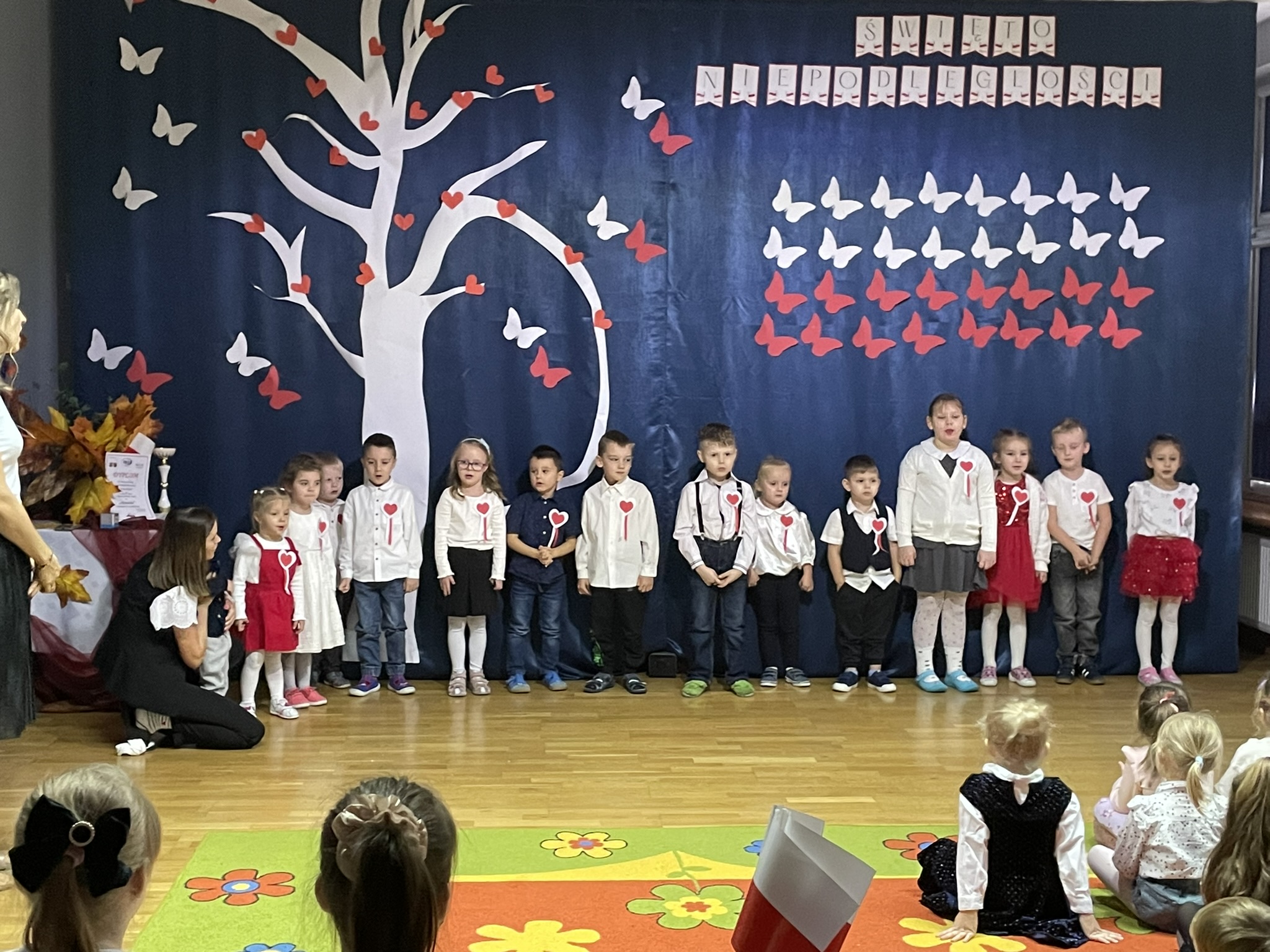 Dnia 8 listopada obchodziliśmy w naszym przedszkolu Narodowe Święto Niepodległości. Z tej okazji dzieci przyszły ubrane na galowo i uroczyście świętowały ten wyjątkowy dla Nas – Polaków dzień. Odbyła się uroczysta akademia z udziałem Dyrektor Wydziału Zdrowia, Oświaty, Kultury i Spraw Pani Marioli Perz; dzieci zaprezentowały patriotyczne pieśni i inscenizację muzyczno- taneczną ,, Pisk Białego Orła”. Na koniec całe przedszkole wzięło udział w akcji „Szkoła do hymnu” polegającej na uroczystym odśpiewaniu „Mazurka Dąbrowskiego”. Święto Odzyskania Niepodległości zdecydowanie był radosnym dniem w naszym przedszkolu i mamy nadzieję, że pozostanie w pamięci naszych „Małych Polaków”.