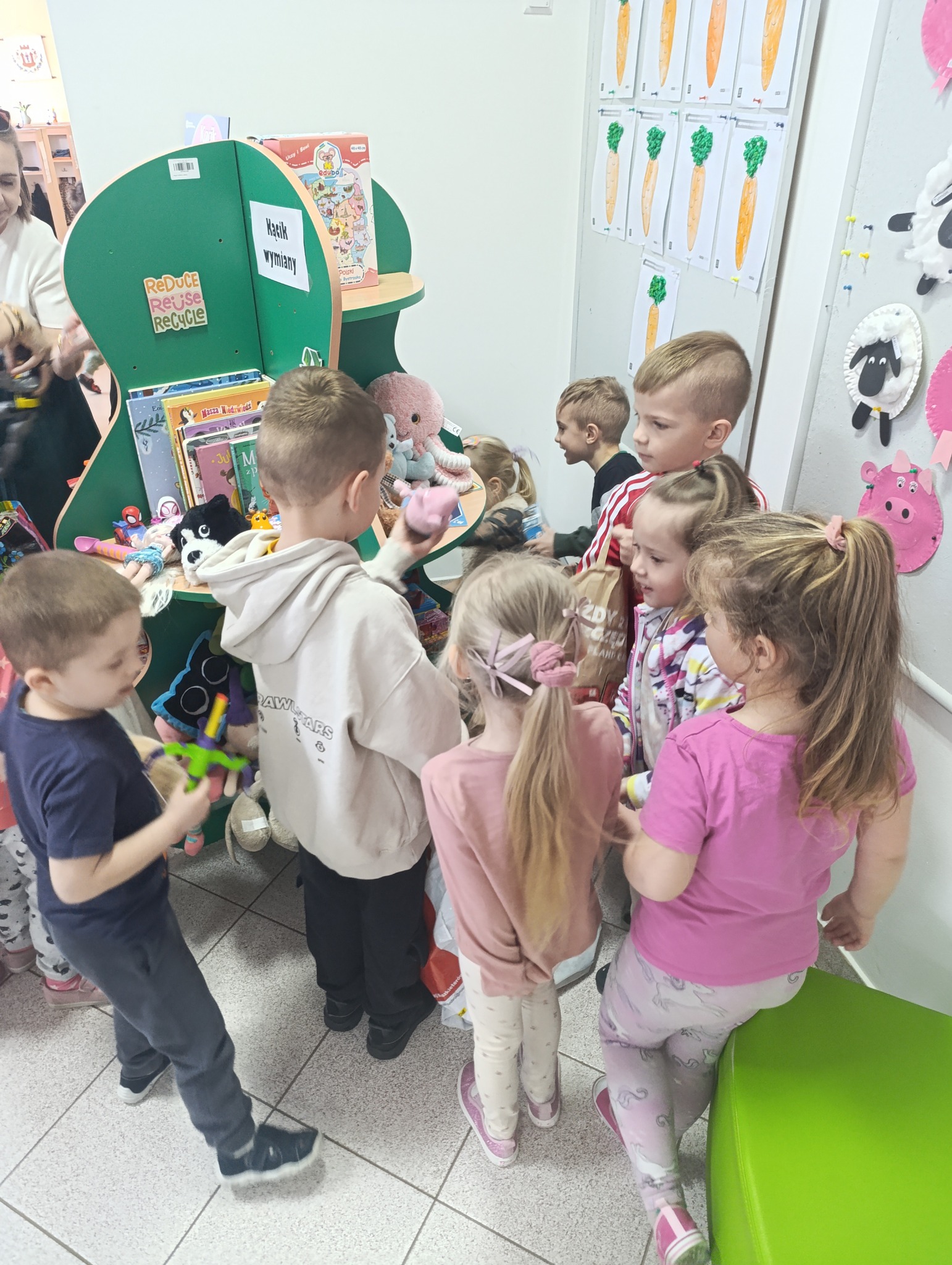 W efekcie tego w naszej placówce powstał Kącik Wymiany, który będzie miejscem, gdzie dzieci mogą wymieniać się zabawkami, książkami i innymi przedmiotami.