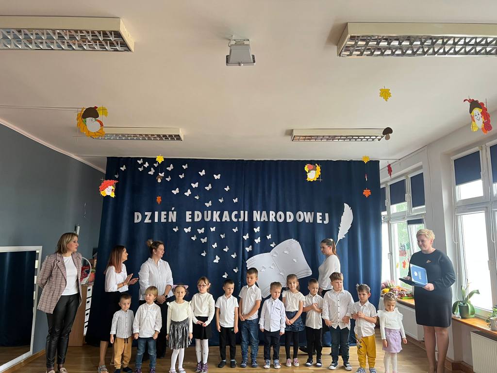 W naszym przedszkolu odbyła się uroczysta akademia z okazji Dnia Edukacji Narodowej – święta wszystkich nauczycieli, wychowawców oraz pracowników oświaty. To wyjątkowy dzień, w którym dzieci mogą wyrazić swoją wdzięczność za trud, cierpliwość i serce wkładane w codzienną pracę z najmłodszymi. Uroczystość rozpoczęła się od krótkiego wystąpienia Pani Dyrektor, która złożyła serdeczne życzenia wszystkim pracownikom przedszkola, dziękując za ich zaangażowanie, troskę i uśmiech, który towarzyszy dzieciom każdego dnia. Następnie na scenie pojawiły się przedszkolaki. W pięknych, odświętnych strojach zaprezentowały przygotowany z wychowawcami program artystyczny. Były wiersze, piosenki i tańce – wszystko poświęcone nauczycielom i pracownikom przedszkola. Po występach nie zabrakło również symbolicznych upominków –wręczonych przez dzieci były pięknym gestem wdzięczności. Cała uroczystość przebiegła w bardzo ciepłej i radosnej atmosferze. Był to dzień pełen serdeczności, uśmiechów i wzajemnych życzeń. Takie chwile przypominają nam, jak ważna i piękna jest praca nauczyciela, a także jak wiele znaczą relacje budowane każdego dnia w przedszkolu.