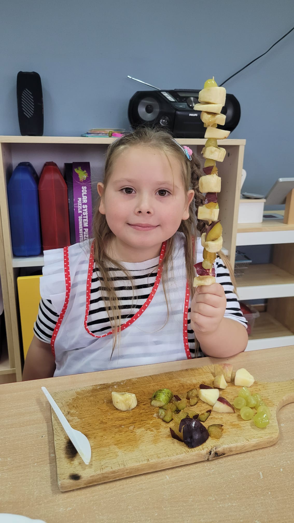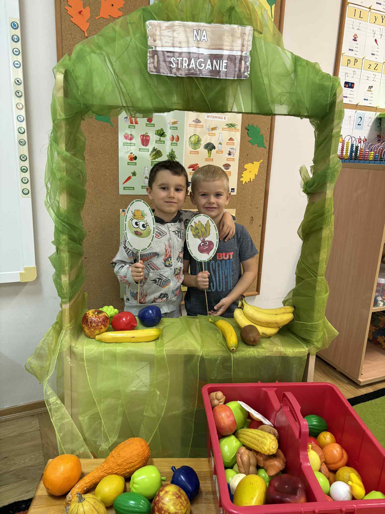 Światowy Dzień Warzyw i Owoców. Dzieci obejrzały teatrzyk pt. „Na straganie”, utrwalając wiedzę o zdrowym odżywianiu. Podczas kodowania na dywanie ćwiczyły liczenie i cyfry. Przedszkolaki przygotowały pyszny zdrowy sok owocowo-warzywny. Na zakończenie przygotowały pyszne szaszłyki owocowe, które z chęcią zajadały