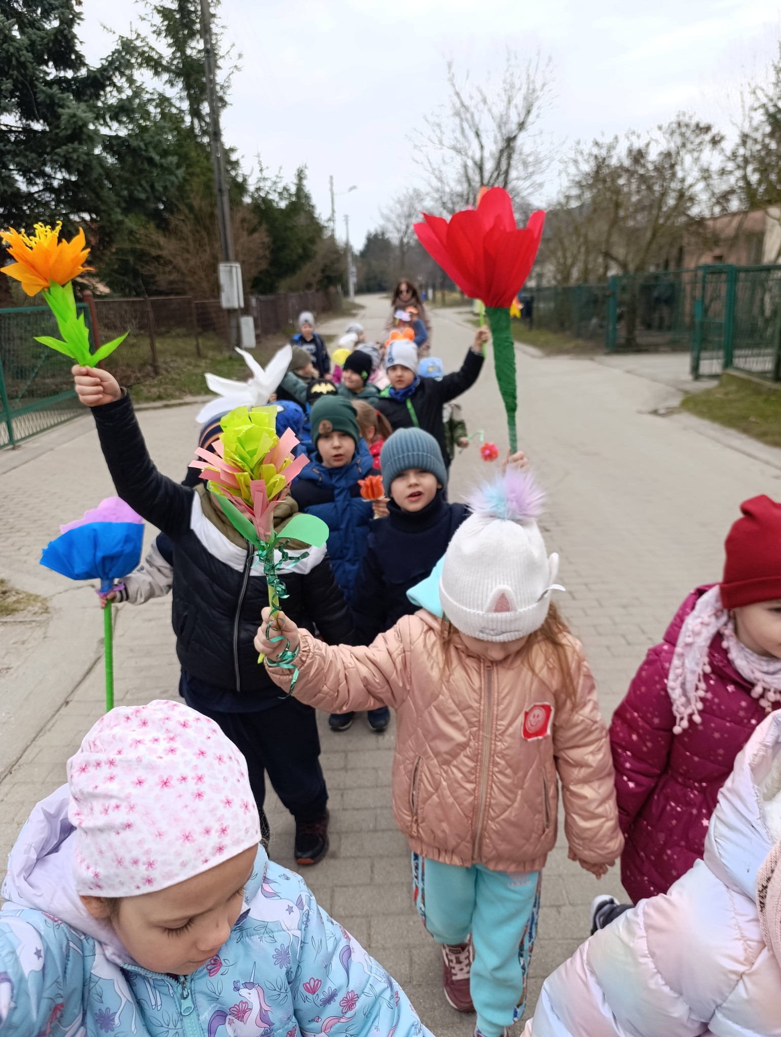 Dzieci wyruszyły na spacer barwnym korowodem, niosąc wiosnę ulicami – było głośno, wesoło i niezwykle kolorowo. Śmiech i energia towarzyszyły nam na każdym kroku, a wiosenna atmosfera udzieliła się wszystkim dookoła.