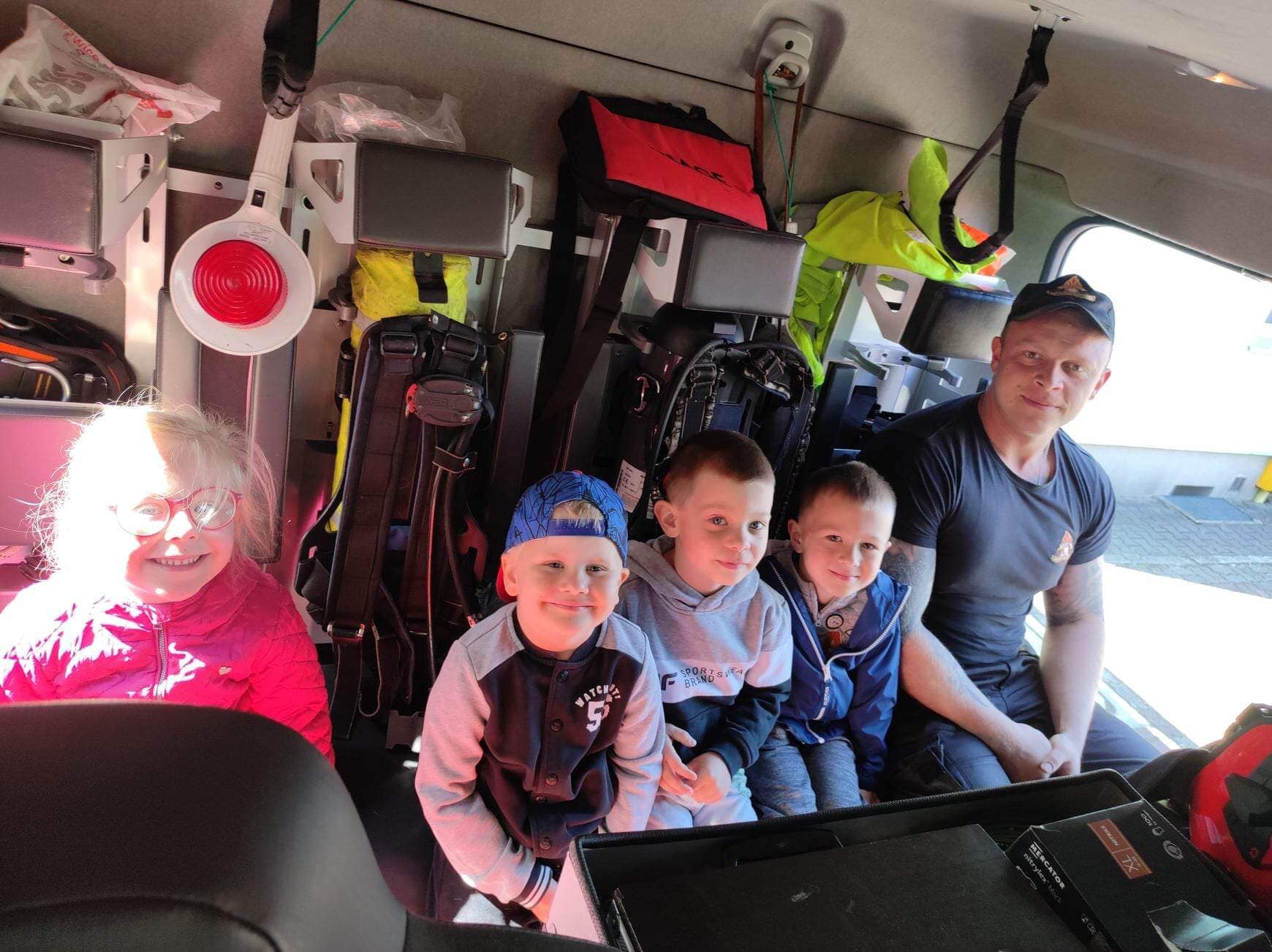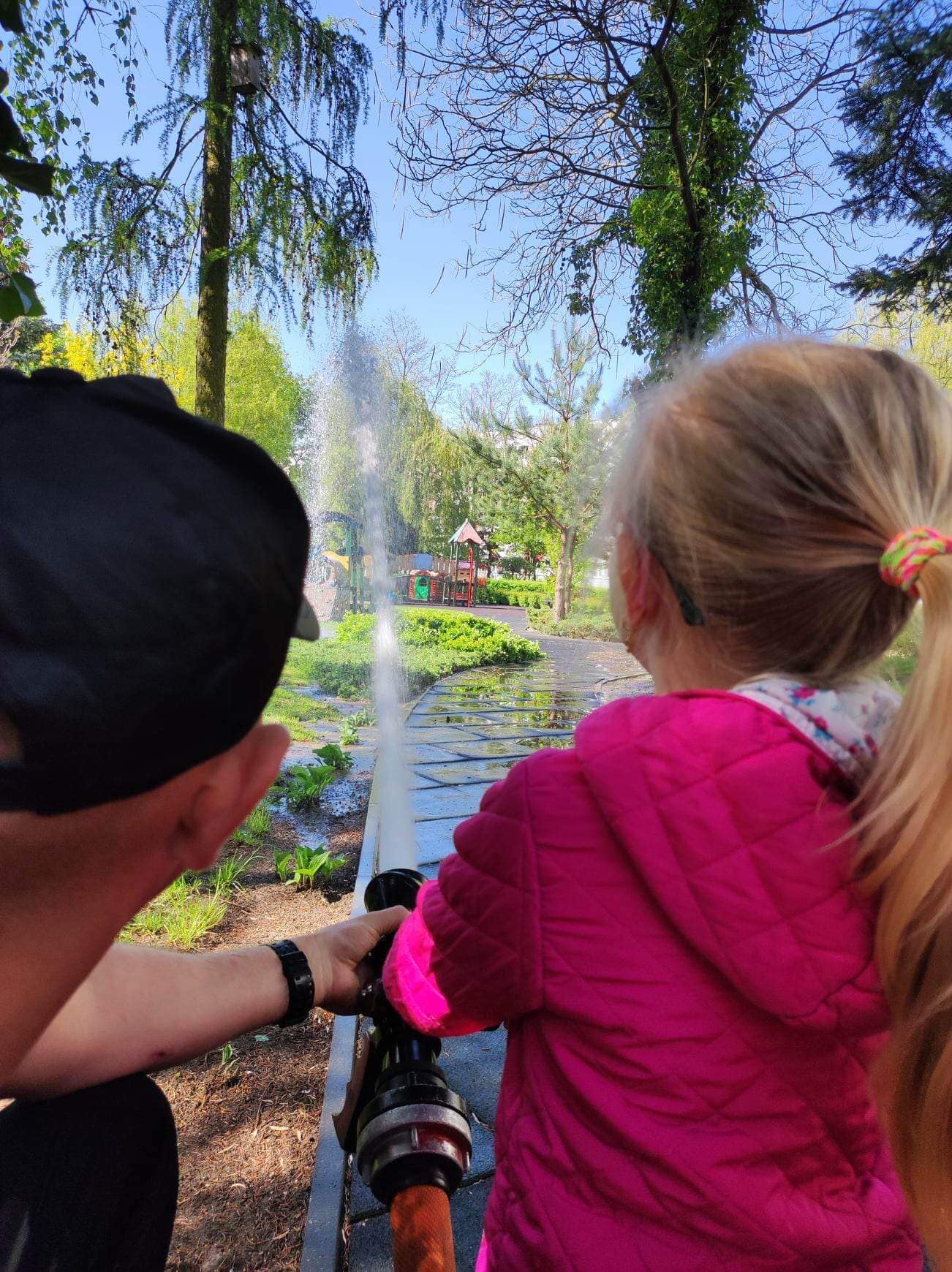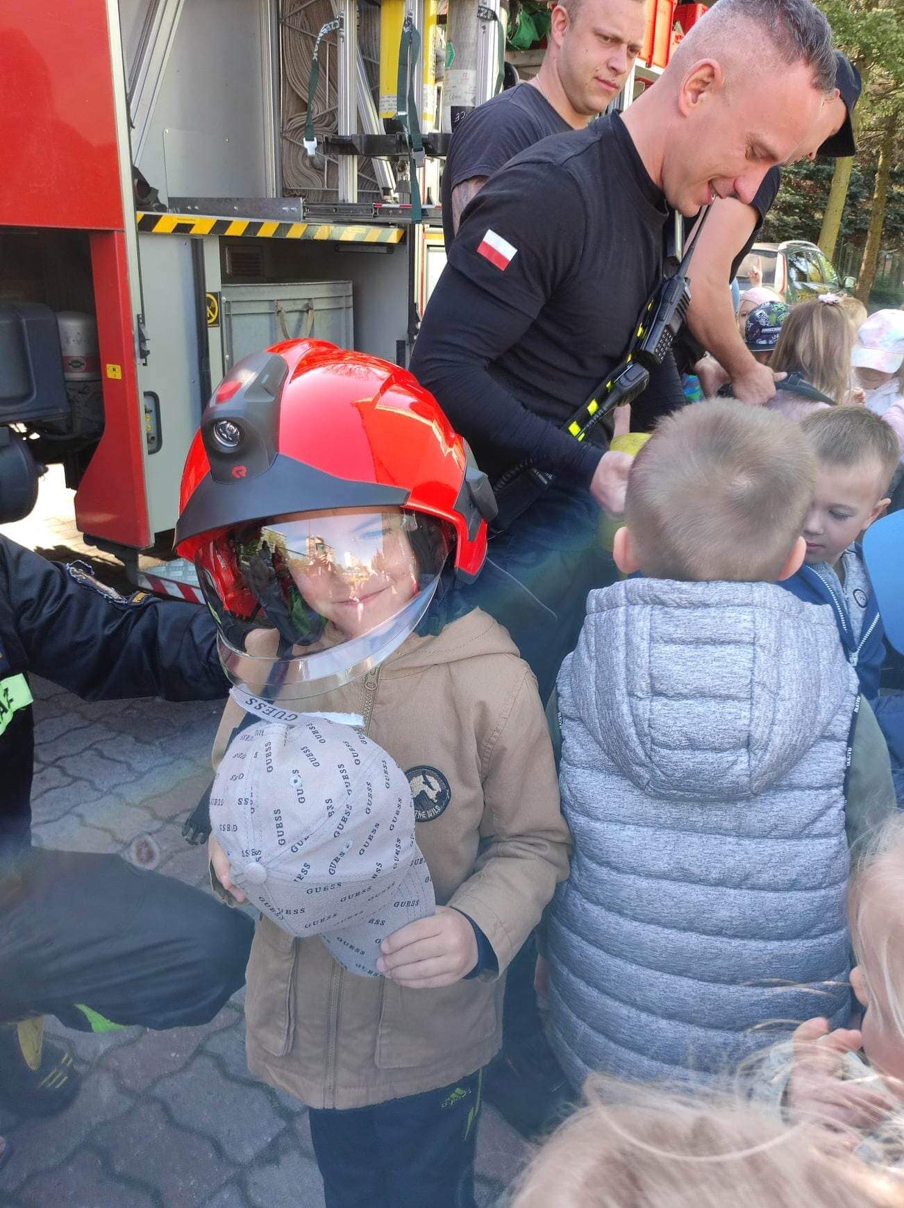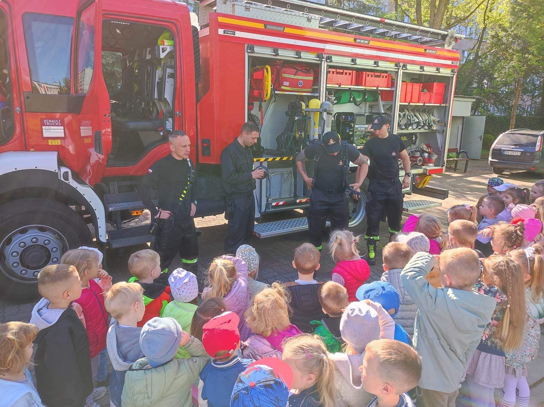 Dnia 11.05.23r. odwiedziła nas Straż Pożarna. Wizyta panów strażaków wzbudziła ogromne zainteresowanie przedszkolaków, jednak największym powodzeniem cieszył się wóz strażacki. Każdy mógł z bliska poznać wyposażenie, jakim strażacy dysponują podczas swojej ciężkiej i odpowiedzialnej pracy. Każdy chętny przedszkolak choć przez chwilę mógł poczuć się jak prawdziwy strażak kiedy założył strażacki kask i puszczał wodę z węża strażackiego.