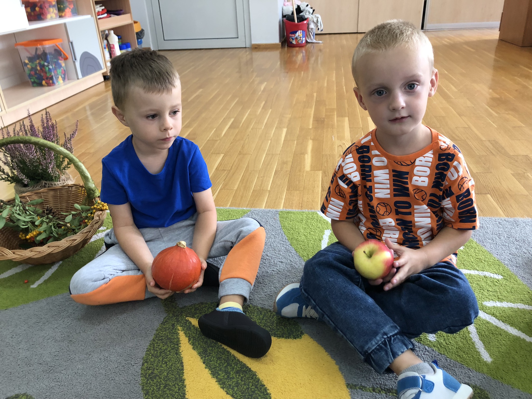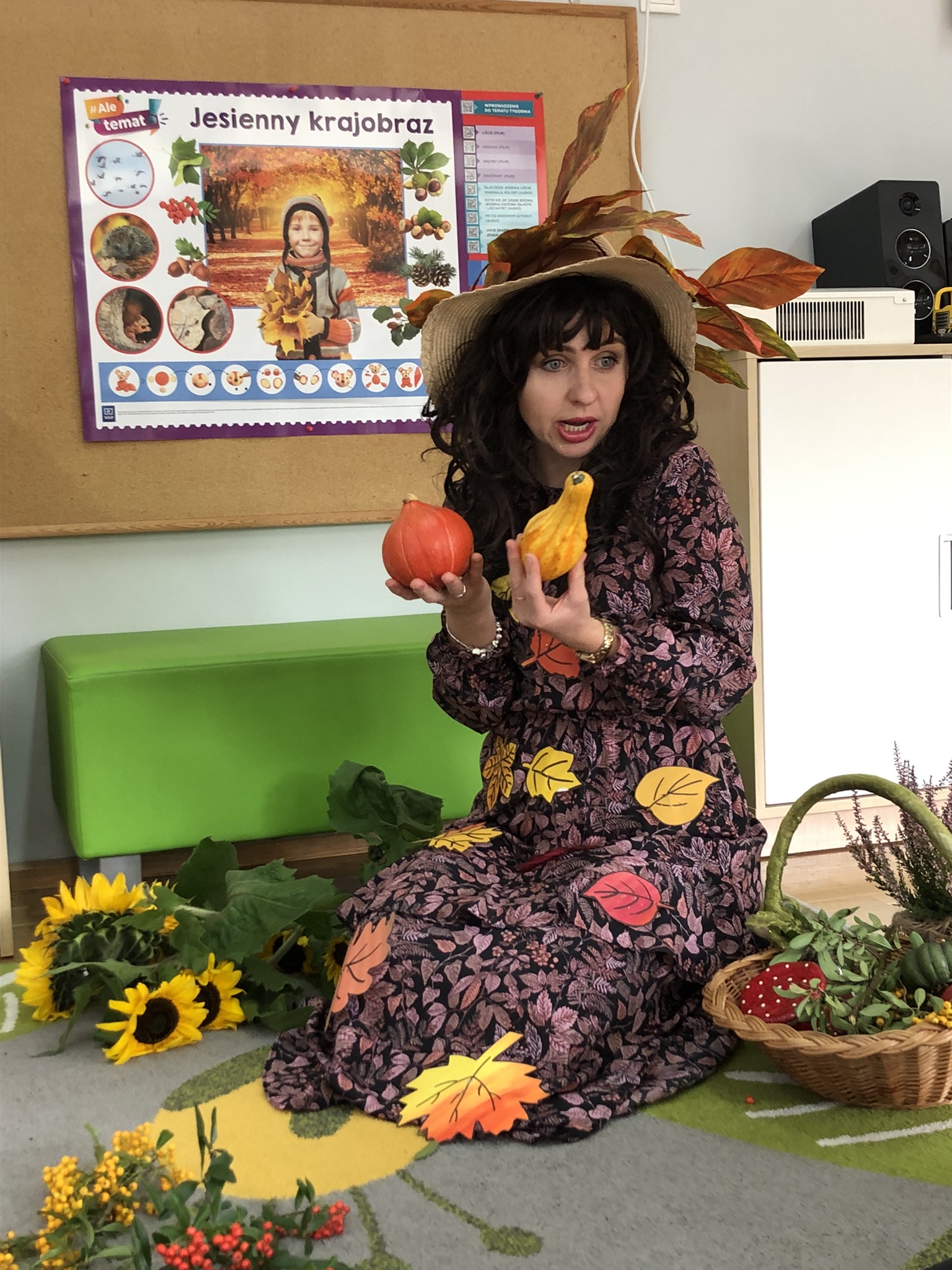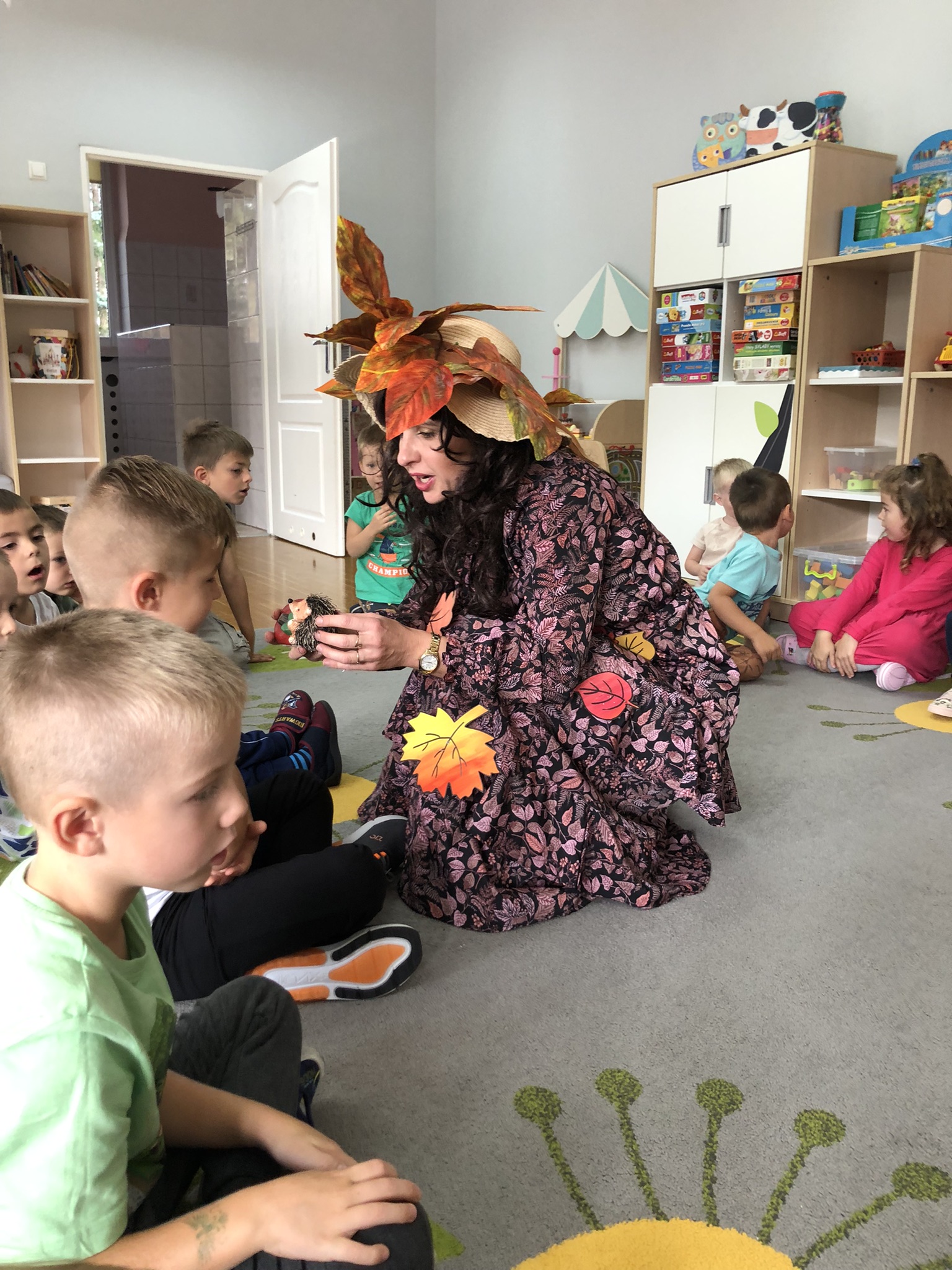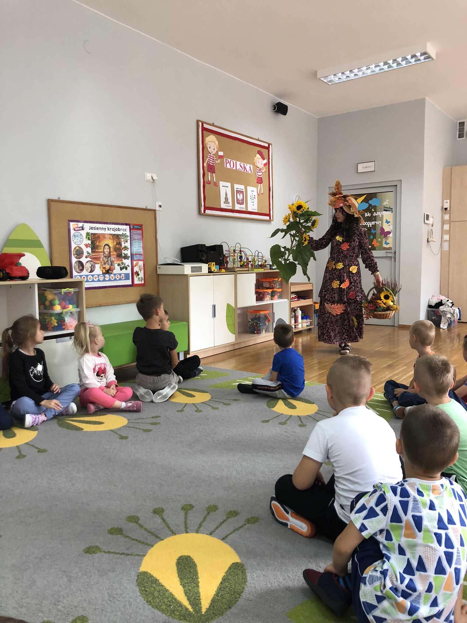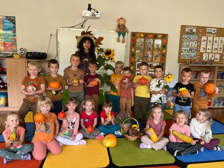 Dnia 25 września w naszym przedszkolu można było spotkać Panią Jesień, która zawitała do każdej sali i przyniosła koszyk pełen jesiennych darów. Dzieci zastanawiały się, co jest w koszyku. Odgadywały jesienne zagadki, rozpoznawały dary jesieni poprzez dotyk. Pani Jesień przedstawiając się opowiedziała dzieciom o sobie wymieniając charakterystyczne cechy jesieni. Wspólnie z dziećmi bawiła się, a na zakończenie zabrzmiała wesoła piosenka. Żegnając się z dziećmi Pani Jesień obiecała, że wróci w przyszłym roku.
