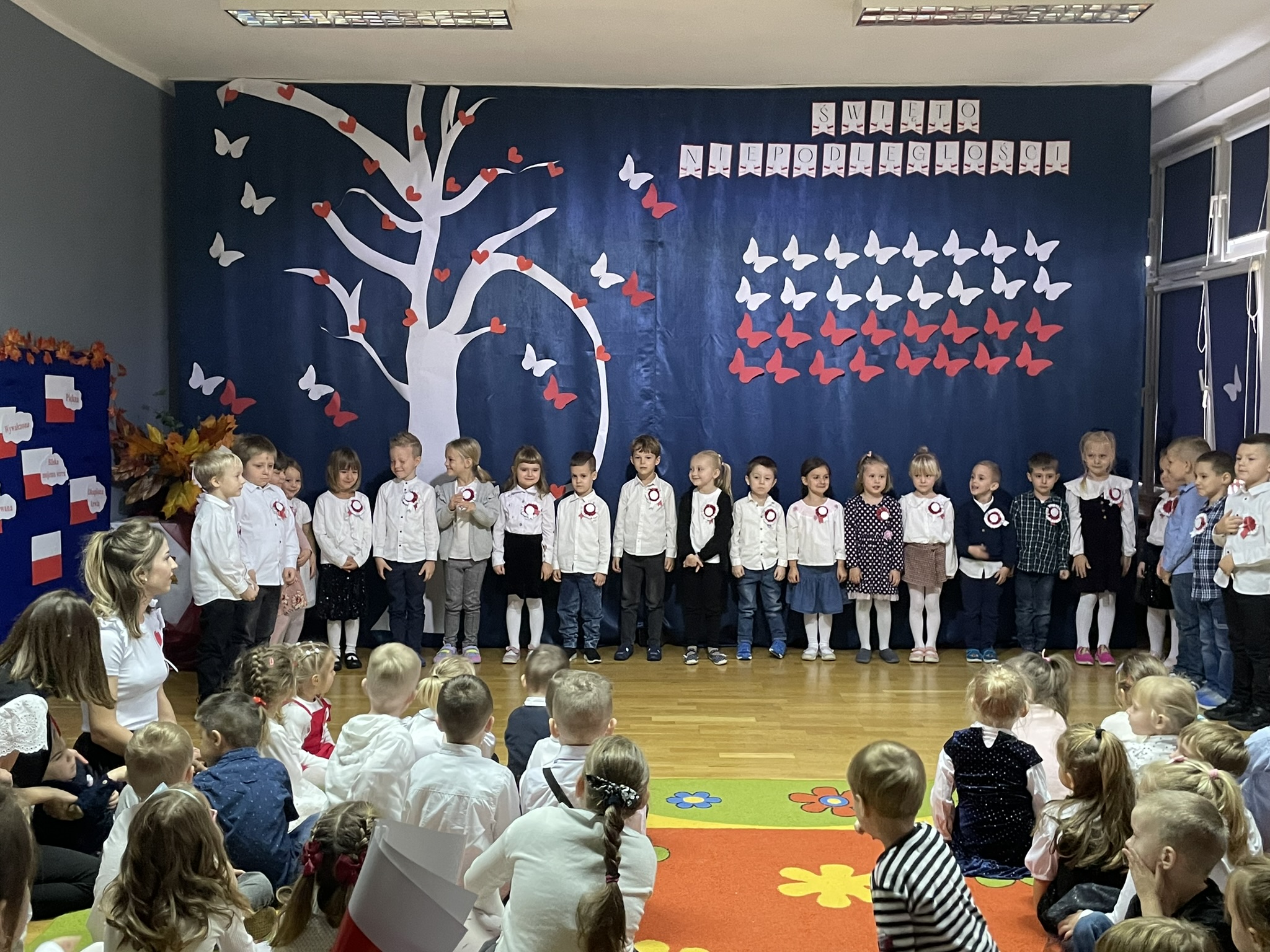 Dnia 8 listopada obchodziliśmy w naszym przedszkolu Narodowe Święto Niepodległości. Z tej okazji dzieci przyszły ubrane na galowo i uroczyście świętowały ten wyjątkowy dla Nas – Polaków dzień. Odbyła się uroczysta akademia z udziałem Dyrektor Wydziału Zdrowia, Oświaty, Kultury i Spraw Pani Marioli Perz; dzieci zaprezentowały patriotyczne pieśni i inscenizację muzyczno- taneczną ,, Pisk Białego Orła”. Na koniec całe przedszkole wzięło udział w akcji „Szkoła do hymnu” polegającej na uroczystym odśpiewaniu „Mazurka Dąbrowskiego”. Święto Odzyskania Niepodległości zdecydowanie był radosnym dniem w naszym przedszkolu i mamy nadzieję, że pozostanie w pamięci naszych „Małych Polaków”.