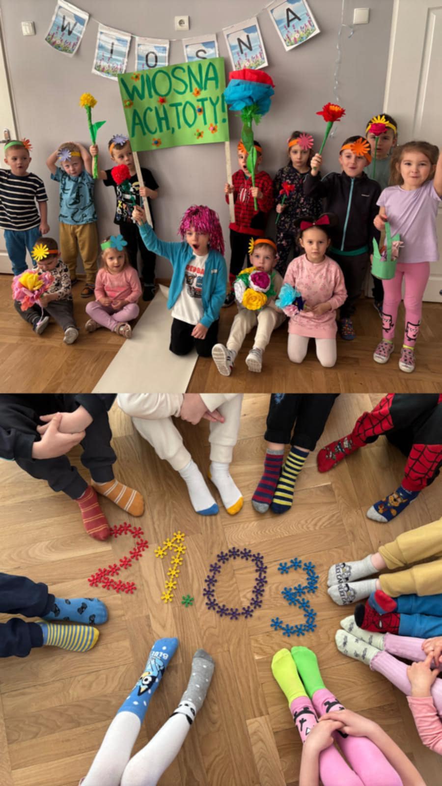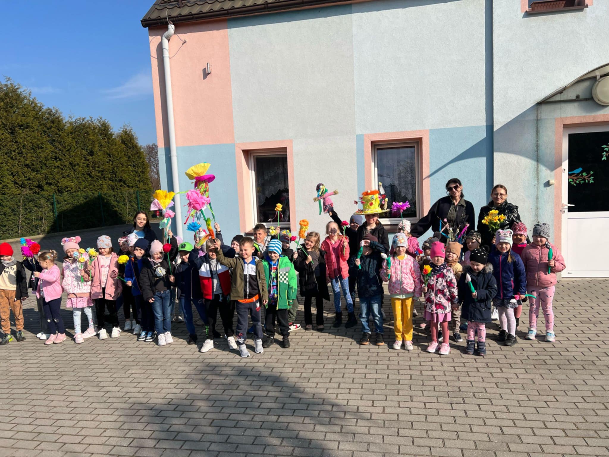 W naszym przedszkolu od rana świętowaliśmy nadejście Wiosny. Aby podkreślić charakter tego wydarzenia przedszkolaki wybrały się na wiosenny korowód z kwiatami. W grupie Smerfy odbył się pokaz mody wiosennej. Dzieci z grupy Skrzaty i Pszczółki odbyły wycieczkę do Tarnówka, gdzie radośnie powitały Wiosnę. Biedronki wzięły udział w akcji sadzenia lasu w Sobinie. W tym dniu było kolorowo i bardzo wesoło.