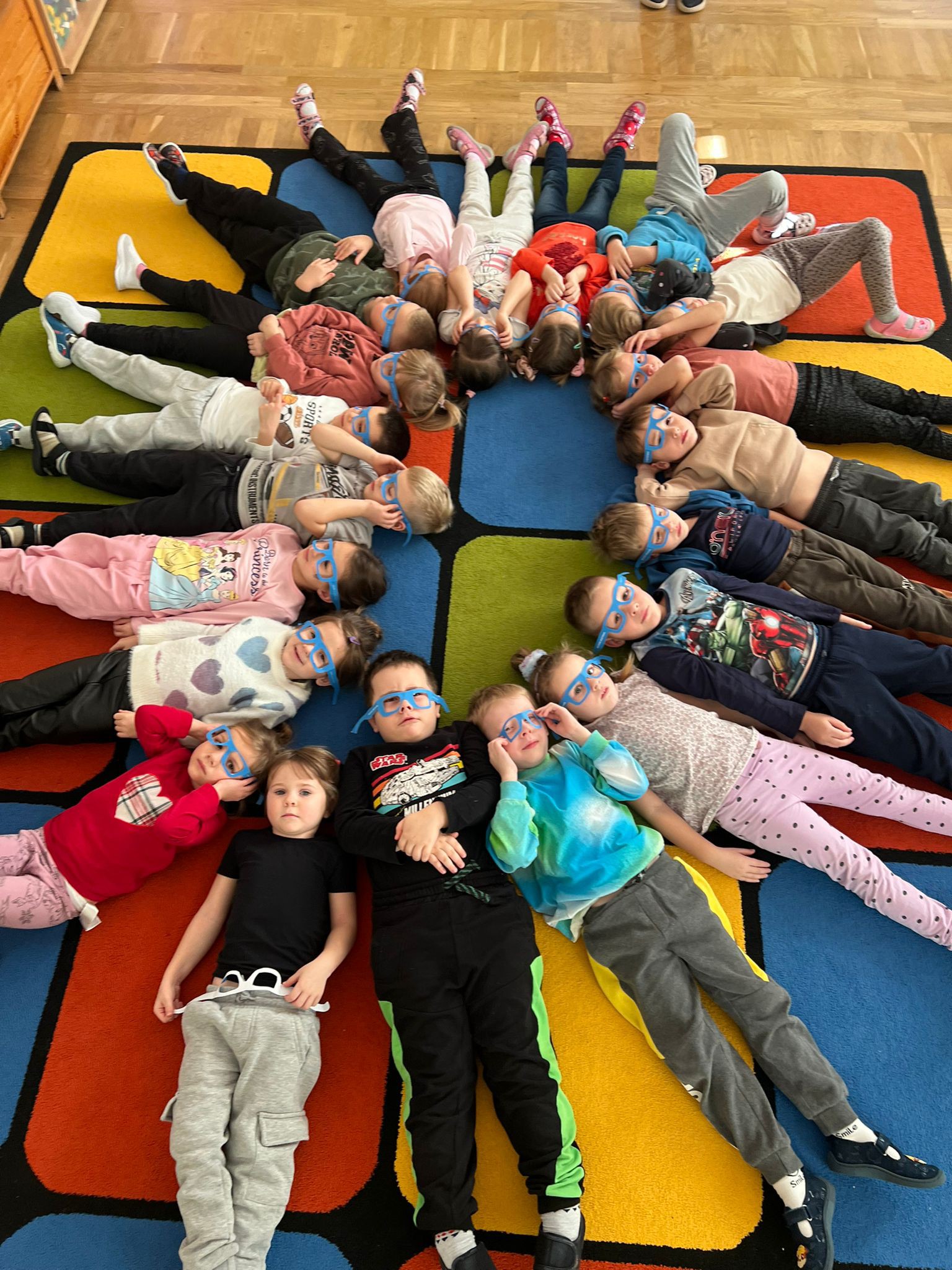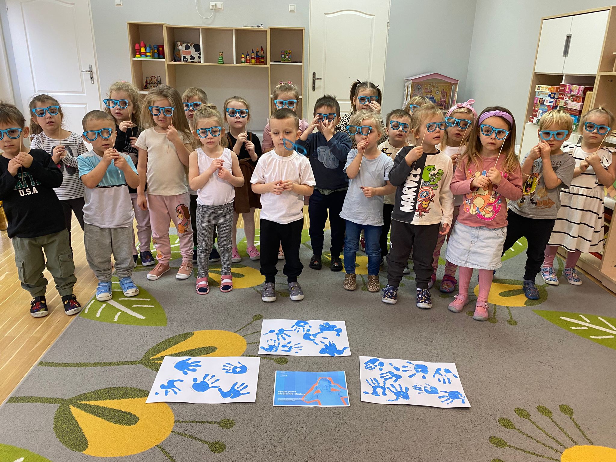 Podczas zajęć pojawiły się także niebieskie okulary – symbol patrzenia na świat oczami dziecka. To proste, ale bardzo ważne przypomnienie, że dziecięcy punkt widzenia wymaga naszej uwagi, empatii i szacunku.