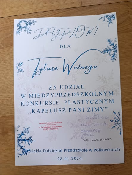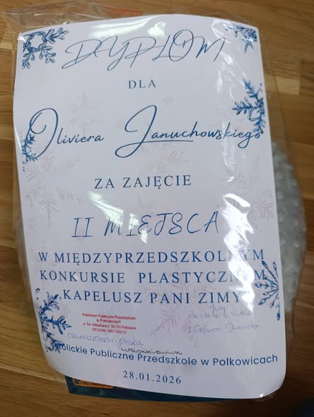 Nasze przedszkolaki bardzo chętnie biorą udział w konkursach międzyprzedszkolnych . Tym razem Olivier i Tytus z grupy Skrzaty wzięli udział w konkursie "Kapelusz Pani Zimy" organizowanym przez Katolickie Publiczne Przedszkole w Polkowicach. Miło nam poinformować, Olivier zajął II miejsce.Ogromne gratulacje