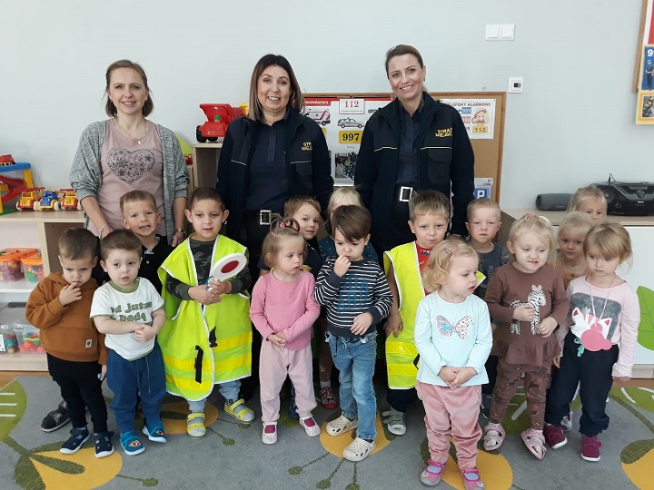 W dniu 23.09.2022r w naszym przedszkolu gościliśmy pracowników ze Straży Miejskiej w Polkowicach. Podczas spotkania dzieci zapoznały się z pracą strażnika miejskiego oraz oglądały elementy umundurowania. Przedszkolaki miały okazję wykazać się wiedzą na temat znajomości bezpieczeństwa na drodze oraz funkcji sygnalizacji świetlnej. Spotkanie odbyło się w miłej atmosferze z aktywnym udziałem dzieci. Dzieci otrzymały od strażników miejskich kolorowe odblaski.