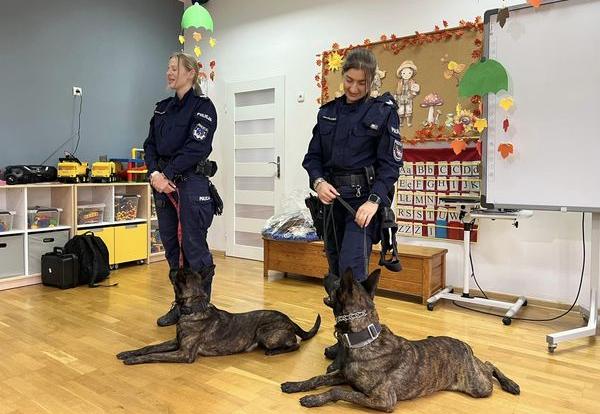 W ramach Gminnego Programu Przeciwdziałania Narkomanii gościliśmy w przedszkolu policjantki, które przeprowadziły zajęcia warsztatowe z udziałem psa patrolowo-tropiącego i psa do wykrywania narkotyków.